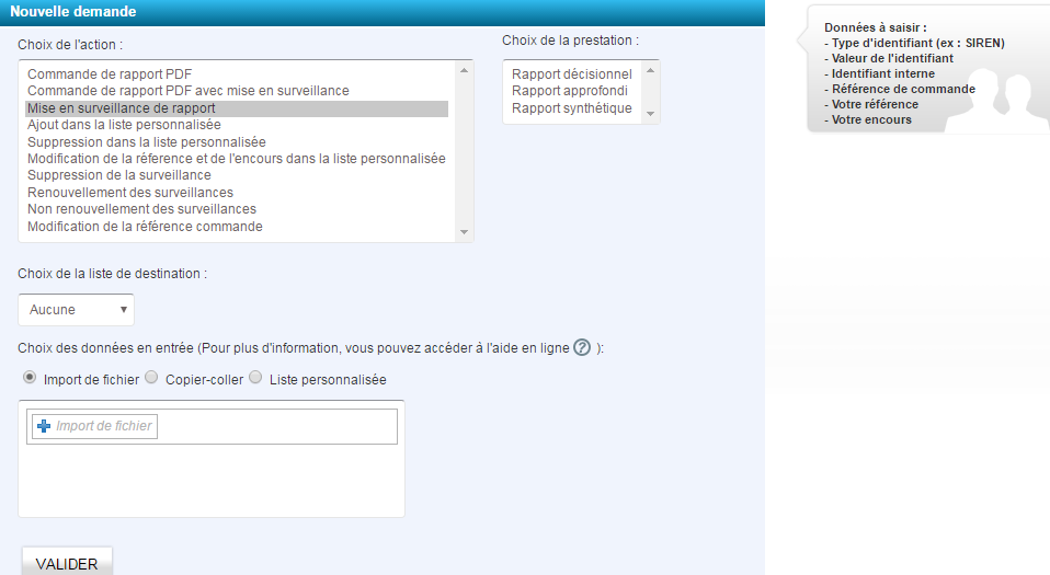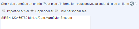 Type d'identifiant (ex : SIREN);Valeur de l'identifiant; Identifiant interne; Référence de commande; Votre référence; Votre encours