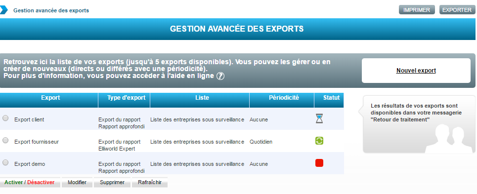 La gestion avancée des exports propose la liste des exports déjà disponibles (5 maximum),  l’accès à la création d’un nouvel export, la possibilité de supprimer modifier ou activer/désactiver un export.