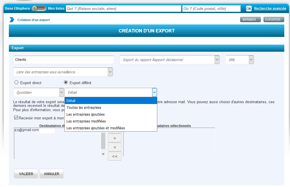 Un mail est envoyé sur la messagerie de l’utilisateur et des destinataires sélectionnés dans l’export, de la part de hotline-information@ellisphere.com. Le fichier en attachement contient de résultat de l’export.