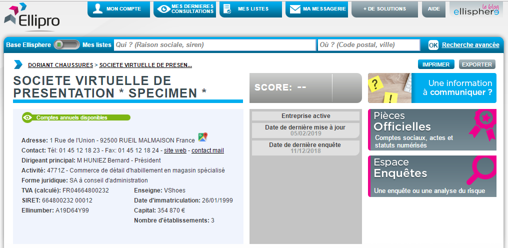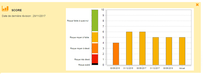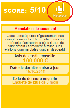 Si l’entreprise n’est pas surveillée, le score n’est pas visible et l’étiquette est grise, sauf si un rapport vient d’être consulté. Dans ce cas le score et l’avis de crédit sont visibles le temps de la session.