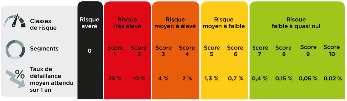 L’algorithme de score permet l’estimation d’une probabilité de défaillance. Cette probabilité est un pourcentage compris entre 0 et 100%. Elle est retranscrite par la suite en segments en découpant en différentes plages l’ensemble des valeurs possibles de 0% à 100%. Ces plages sont non linéaires pour tenir compte du taux de défaillance faible.