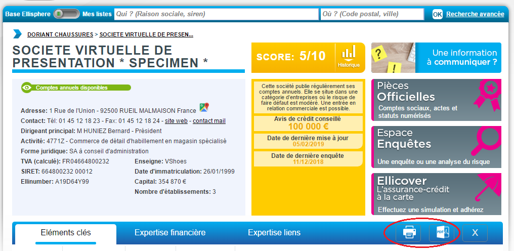 Il est possible d’imprimer ou d’exporter unitairement un rapport au format PDF sur l’entreprise en cours de consultation de rapport.