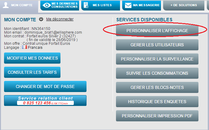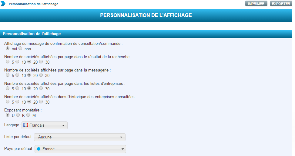 - Nombre de lignes par page (pour le résultat des recherches, la messagerie, une liste d’entreprises et l’historique des sociétés consultées)