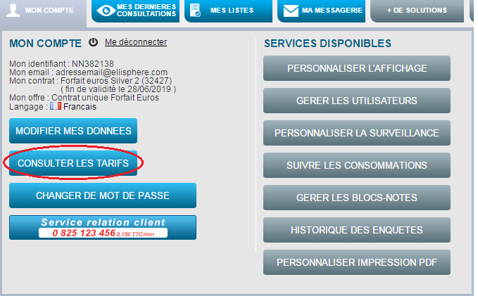 Si vous n'avez pas la possibilité de consulter les tarifs, merci de contacter l'administrateur de votre compte ou le service clients Ellisphere.