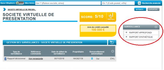 De plus, cette entreprise est présente dans la liste de surveillance, visualisable dans le menu « Mes listes » > « Liste des entreprises sous surveillance ». Se référer au paragraphe La surveillance