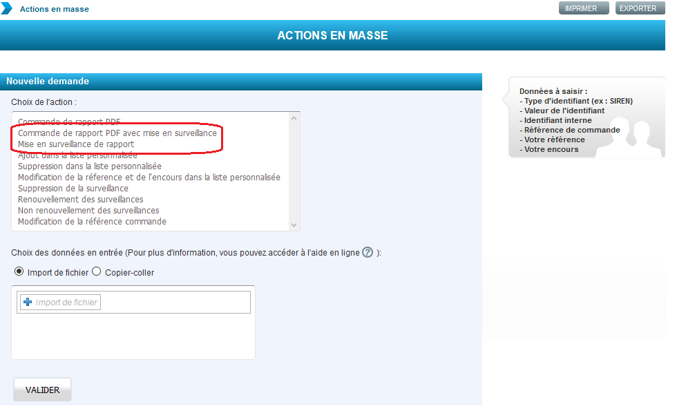 Vous pouvez mettre un ensemble d’entreprises sous surveillance avec une seule action, soit en intégrant un fichier, soit par copier/coller d’identifiants.