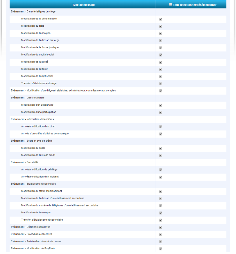 Vous avez également la possibilité de choisir les types de message voir la liste dans le paragraphe Les évènements surveillés.