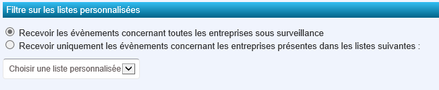 Sur votre liste de surveillance, par défaut vous recevez les évènements de l’ensemble des sociétés que vous surveillez, et ce quel que soit l’utilisateur qui en a fait la demande. Si vous avez créé des listes personnalisées, vous pouvez filtrer les alertes sur une ou plusieurs de ces listes :