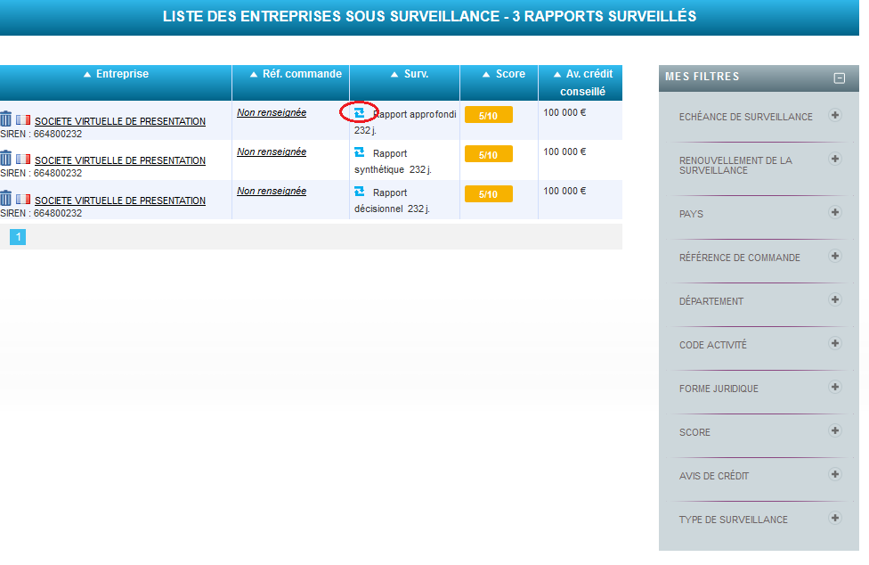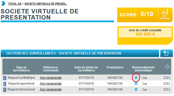 Pour rappel et suivant l’option de renouvellement automatique choisie dans votre contrat, par défaut et sauf action contraire, la surveillance de vos entreprises se renouvelle ou se stoppe automatiquement à la fin de la période de surveillance.
