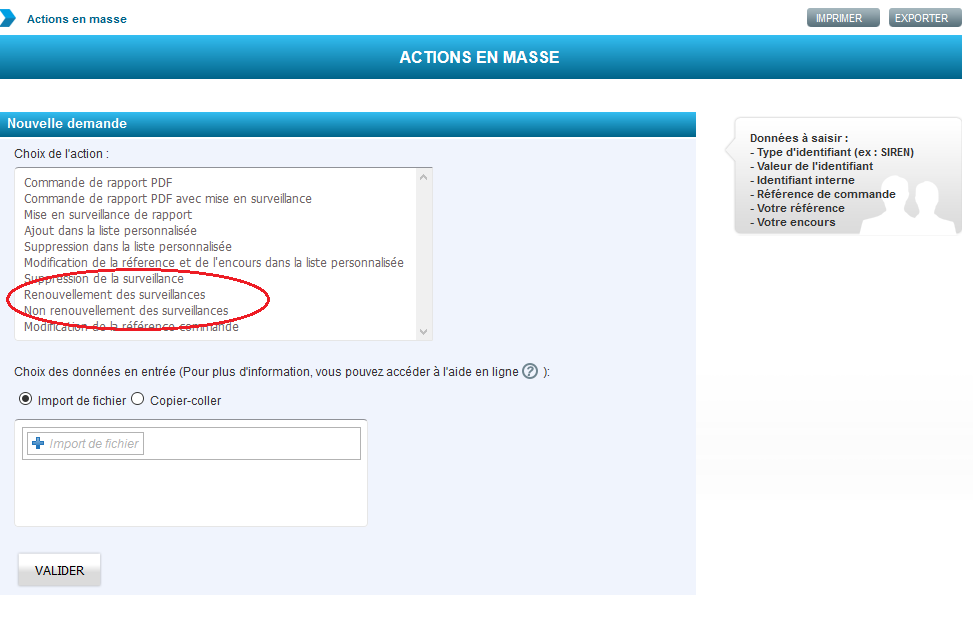 Vous avez la possibilité de renouveler ou non, un ensemble d’entreprises par import de fichier ou copier/coller d’identifiants.