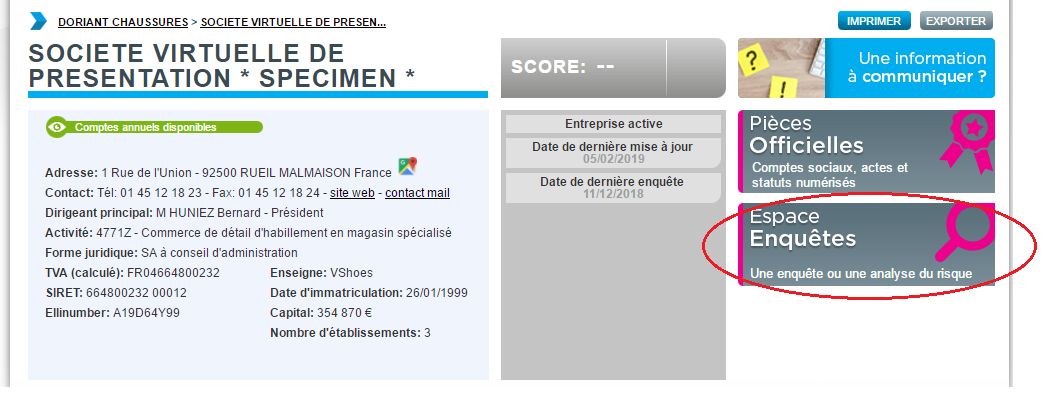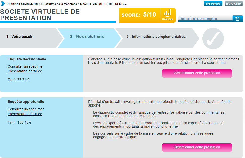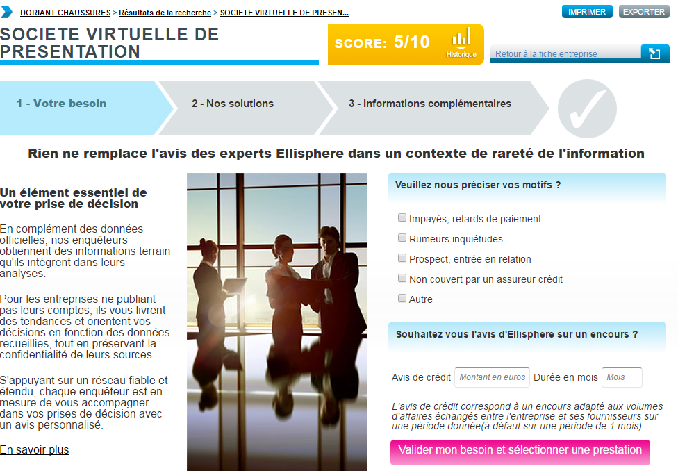 Cette prestation permet d’apporter des éléments nécessaires pour une prise de décision et les détails succincts sur une entreprise (principaux postes du bilan sur 2 ans, dirigeants etc.). Voir Annexe du contrat Ellipro