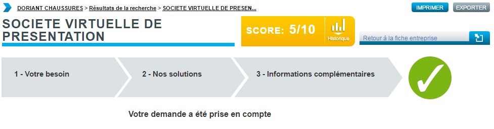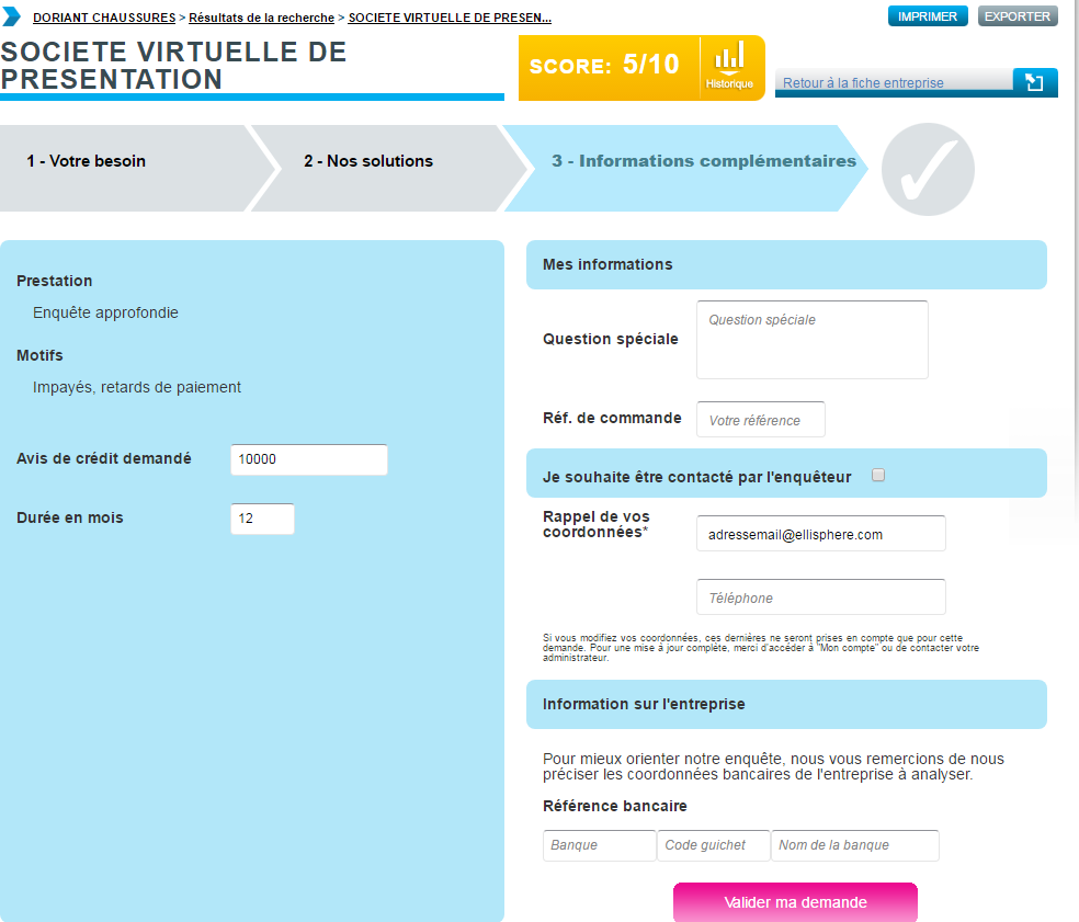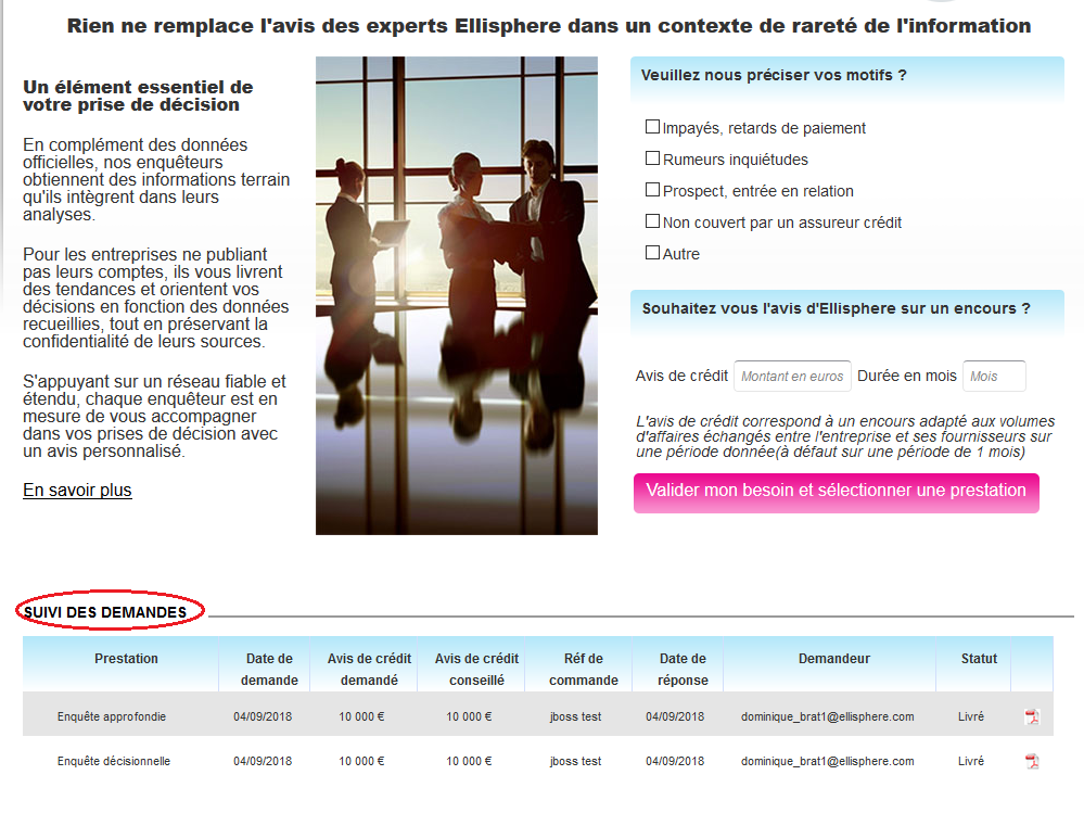 Vous êtes positionné sur la page demandant des précisions sur vos besoins : le suivi de commande s’affiche en bas de page, s’il existe déjà des enquêtes effectuées sur cette entreprise.