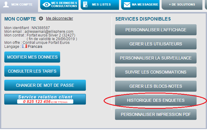 Disponible dans le menu « Mon compte » > « Historique des enquêtes».