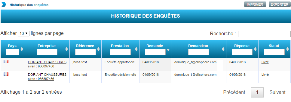 Sont affichées les enquêtes demandées par les utilisateurs autorisés sur le contrat durant les 12 derniers mois sur l’entreprise.