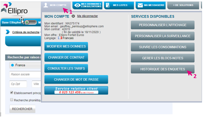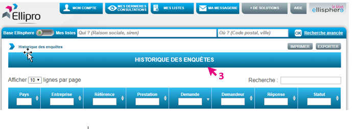 Si vous souhaitez retrouver une enquête dans votre Ellipro, il vous suffit de suivre le lien suivant Mon compte (1) > Historique des enquêtes (2) et vous retrouverez l’ensemble des enquêtes (3) que vous aurez commandé