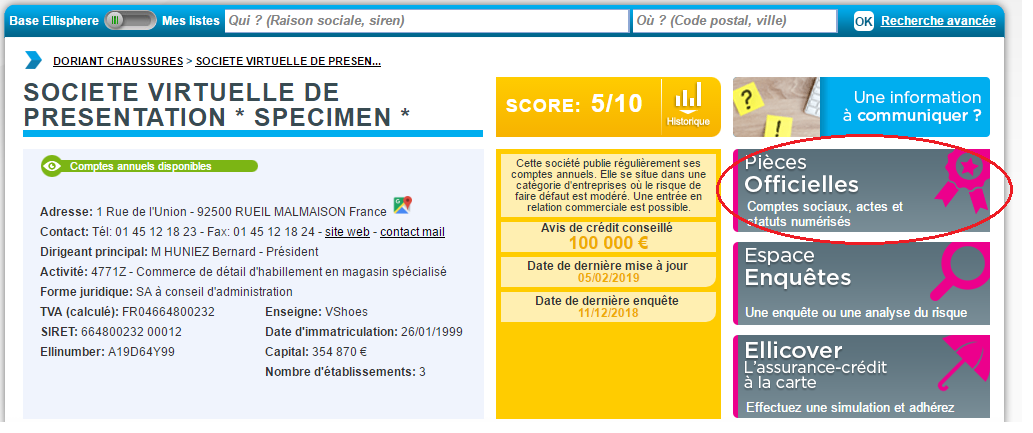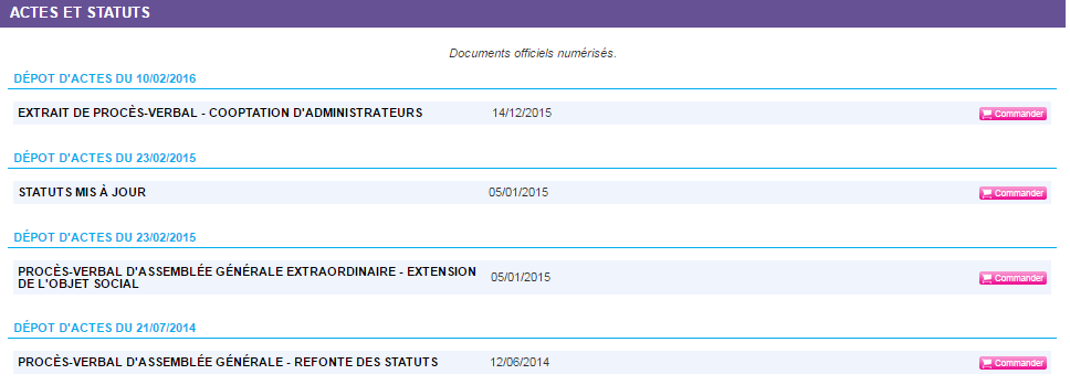 Les pièces officielles peuvent être visualisées et commandées en cliquant sur l’étiquette « Pièces officielles » dans la partie Identité de l’entreprise.