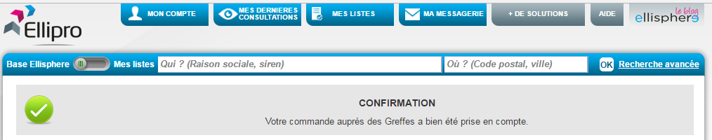 Après validation de la commande, un message est affiché pour la bonne prise en compte auprès des Greffes.